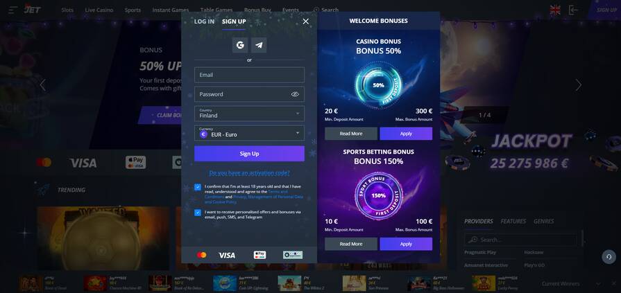Если игрок не зарегистрировался в Jet, то на сайте казино он сможет играть только в демонстрационные версии слотов. Чтобы пополнять счет и выводить средства, иметь возможность настоящего выигрыша и участвовать в программе лояльности, потребуется создать учетную запись.