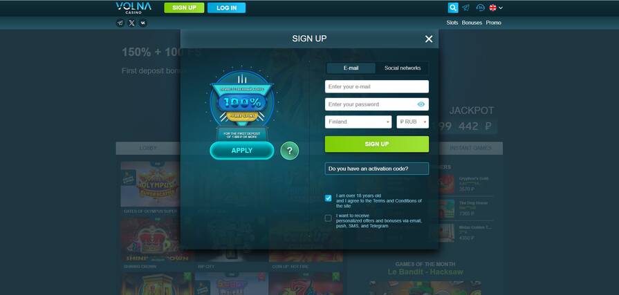 Чтобы приступить к регистрации в казино Volna, требуется зайти на сайт и кликнуть по большой зеленой кнопке. На экране откроется окно, где необходимо выбрать подходящий способ и приступить к созданию учетной записи. Также слева будет виджет с приветственным бонусом, который можно активировать.