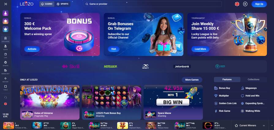 На главной Legzo присутствуют списки с наиболее востребованными слотами, новыми автоматами и играми с джекпотом.