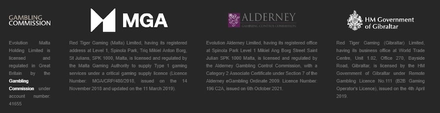 Компания Red Tiger действует исключительно в законном поле, поэтому регулярно проходит сертификацию и лицензирование, позволяющее работать на различных рынках онлайн гемблинга: