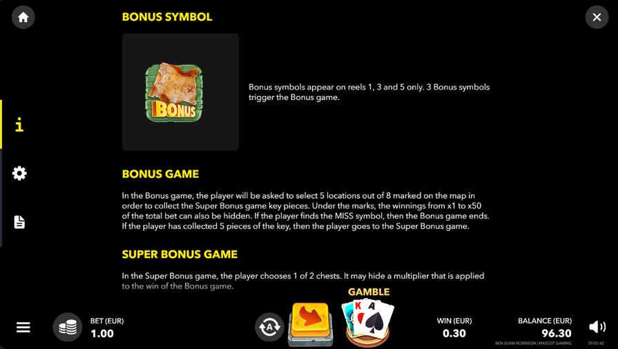 Бонусная игра в Ben Gunn Robinson активируется при выпадении на барабанах трех символов Scatter. Во время нее на экране появляется карта, где отмечено восемь мест. Игрок должен выбрать пять из них. В них скрывается случайный выигрыш от x1 до x50 ставок.
