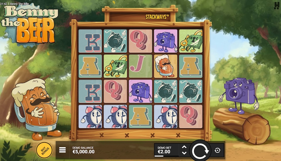 Слот Benny the Beer обладает качественной мультяшной графикой, стилизованной под мультфильмы 80х годов. В качестве заднего фона используется лесная опушка, на которой весело танцуют кружка Бенни и фотоаппарат.