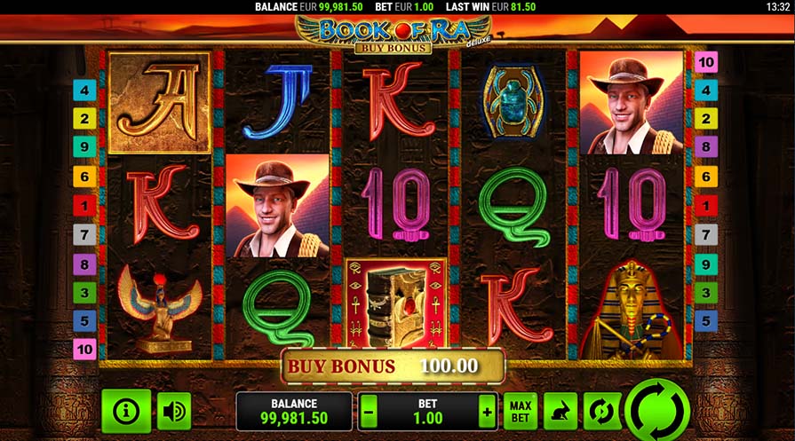 Гемблер может не ждать выпадения бонуса во время обычных спинов. В Book of Ra Deluxe доступна возможность покупки фриспинов за x100 ставок.