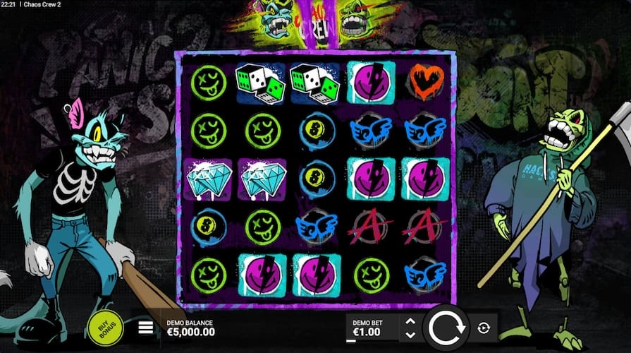Chaos Crew 2 обладает довольно большим максимальным выигрышем. Он составляет 20000x! RTP может варьироваться от 92.41% до 96.27%. Игра осуществляется на поле формата 5*5. Гемблер во время спинов может делать вращения в диапазоне от 0.1 до 100 монет.