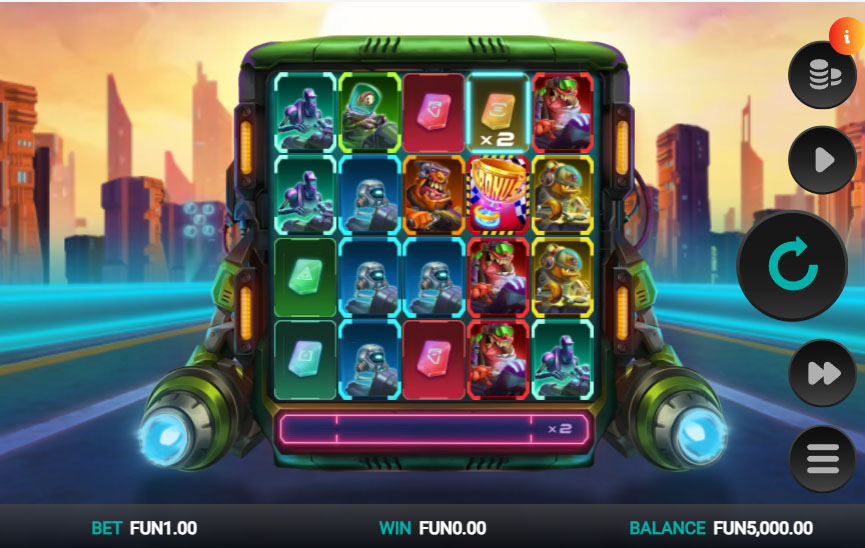 - Роботы гонщики на синем и зеленом фоне. Трехкратное появление дает x0.5, четырехкратное — x1, пятикратное — x2.