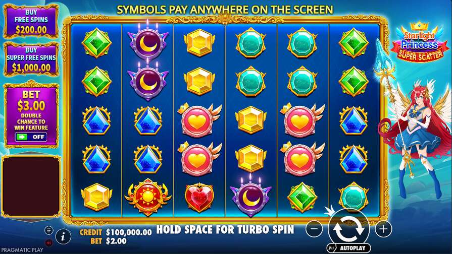 Обычная бонусная игра запускается за x100 ставок. Также в Starlight Princess Super Scatter можно активировать функцию удвоенного шанса запуска фриспинов. При ней ставка за спин увеличивается на 50%.