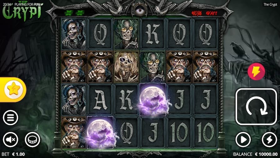 На заднем фоне в The Crypt размещено заброшенное кладбище, над которым находится большая полная луна. Игровое поле расположено по центру. Под ним находятся клавиши управления. С их помощью гемблер может делать вращения, изменять ставку, включать авто и турбо. Там же имеются кнопки для активации бонусной игры и функции xBet.
