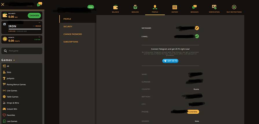 Но перед тем, как приступить этой процедуре, необходимо подтвердить номер телефона и Email. Без этого у гемблера не будет возможности пополнить счет. Ему нужно зайти в личный кабинет на сайте Play Fortuna и перейти в раздел “Profile”. На этой странице находится основная информация об аккаунте. Email размещен практически в самом верху, а телефон расположился внизу страницы.
