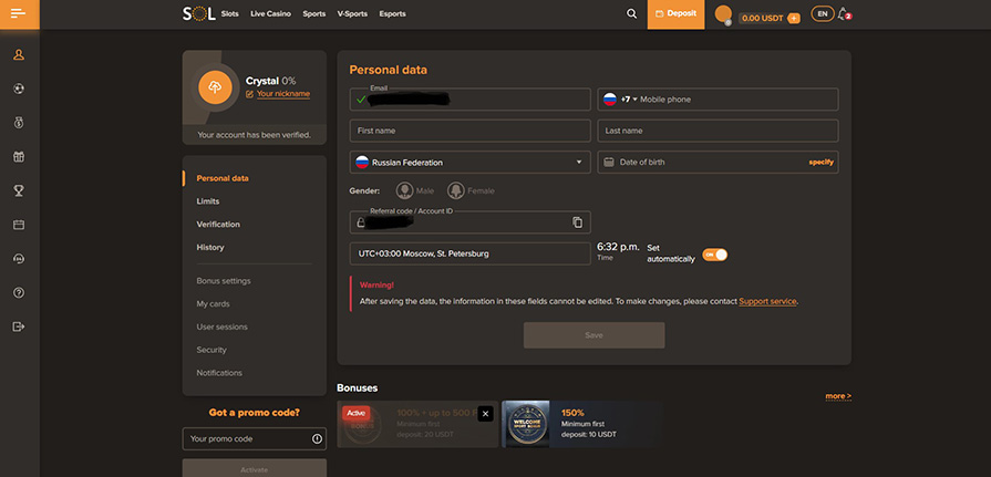 Sol — это казино с большим количеством бонусов, тысячами игровых автоматов, программой лояльности, акциями и другими возможностями. Но чтобы получить к ним доступ, потребуется пройти процедуру верификации. Без подтвержденного аккаунта гемблер не сможет пополнить счет и сыграть на реальные деньги.