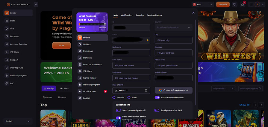 Unlim — казино со стильным дизайном и отсутствием лимитов на финансовые операции. Игроки могут получать разные бонусы, переходить на новые уровни лояльности и пытаться получить крупный выигрыш в тысячах слотов. Но чтобы иметь полный доступ к функциям площадки, требуется пройти верификацию. Без этого гемблер не сможет выводить средства, получать определенные бонусы и подарки.